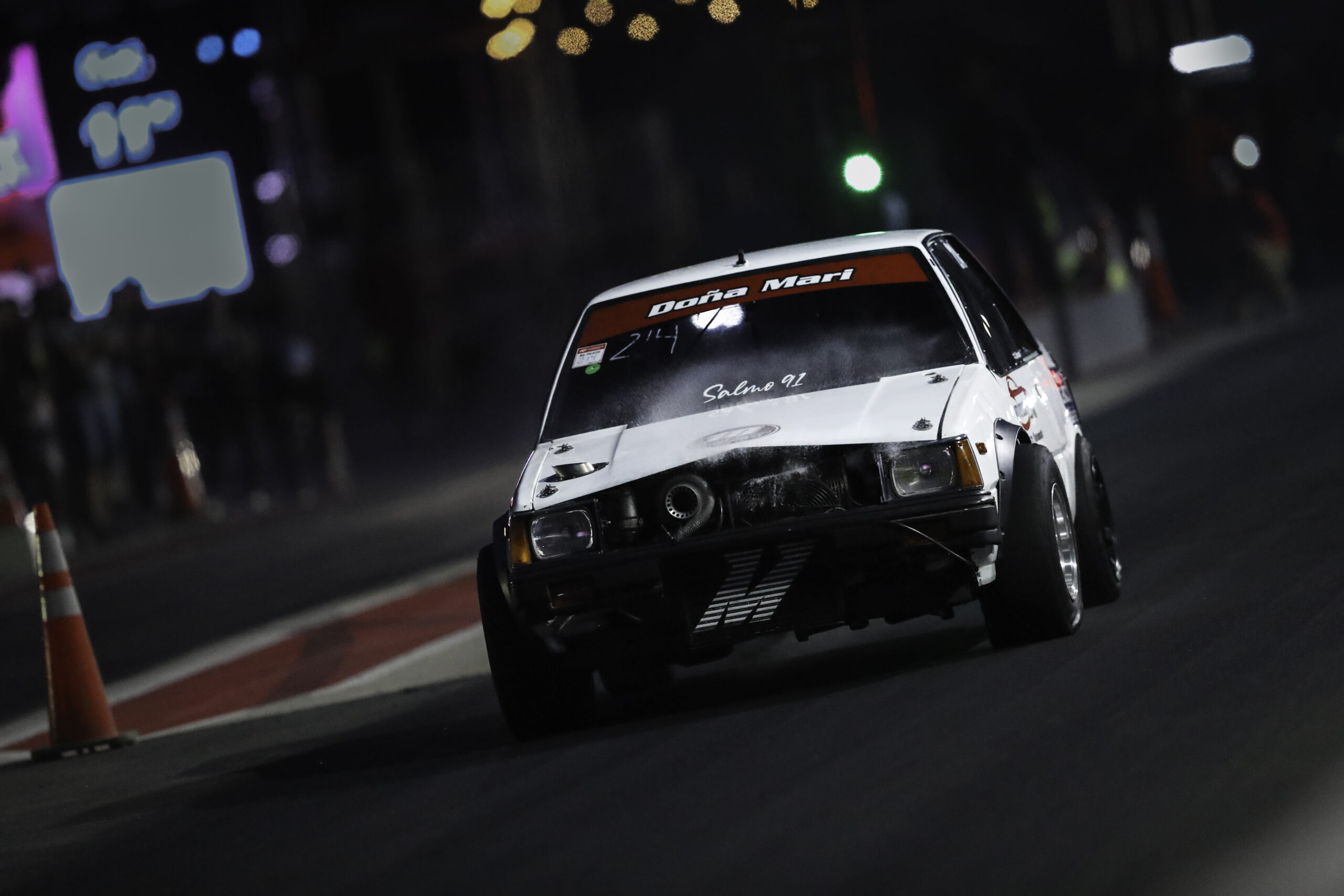demostrando su pericia al volante en la pista de 402 metros con 500 de frenada, diseñada
