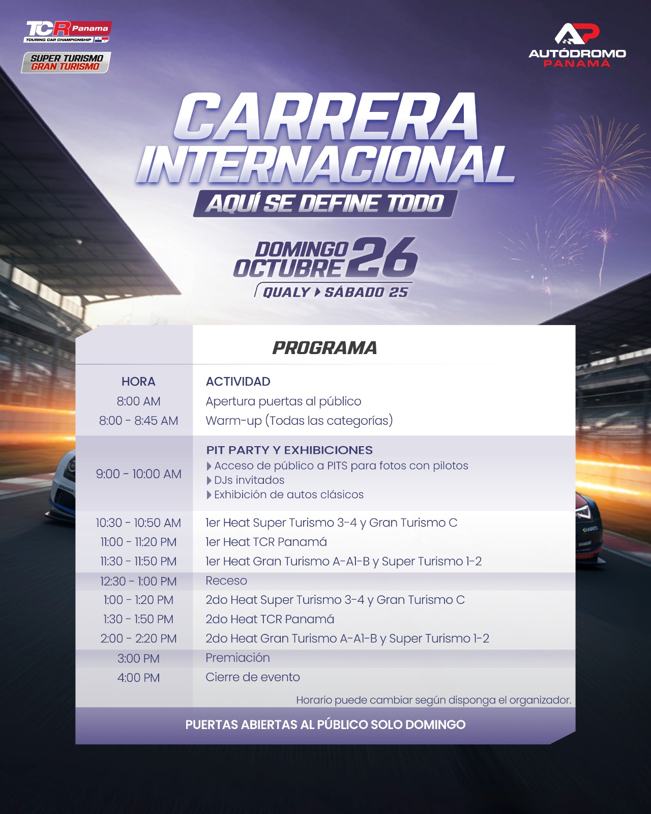 – Queda prohibida la transmisión en vivo (streaming), grabación profesional o cualquier uso comercial sin autorización expresa del Autódromo Panamá.