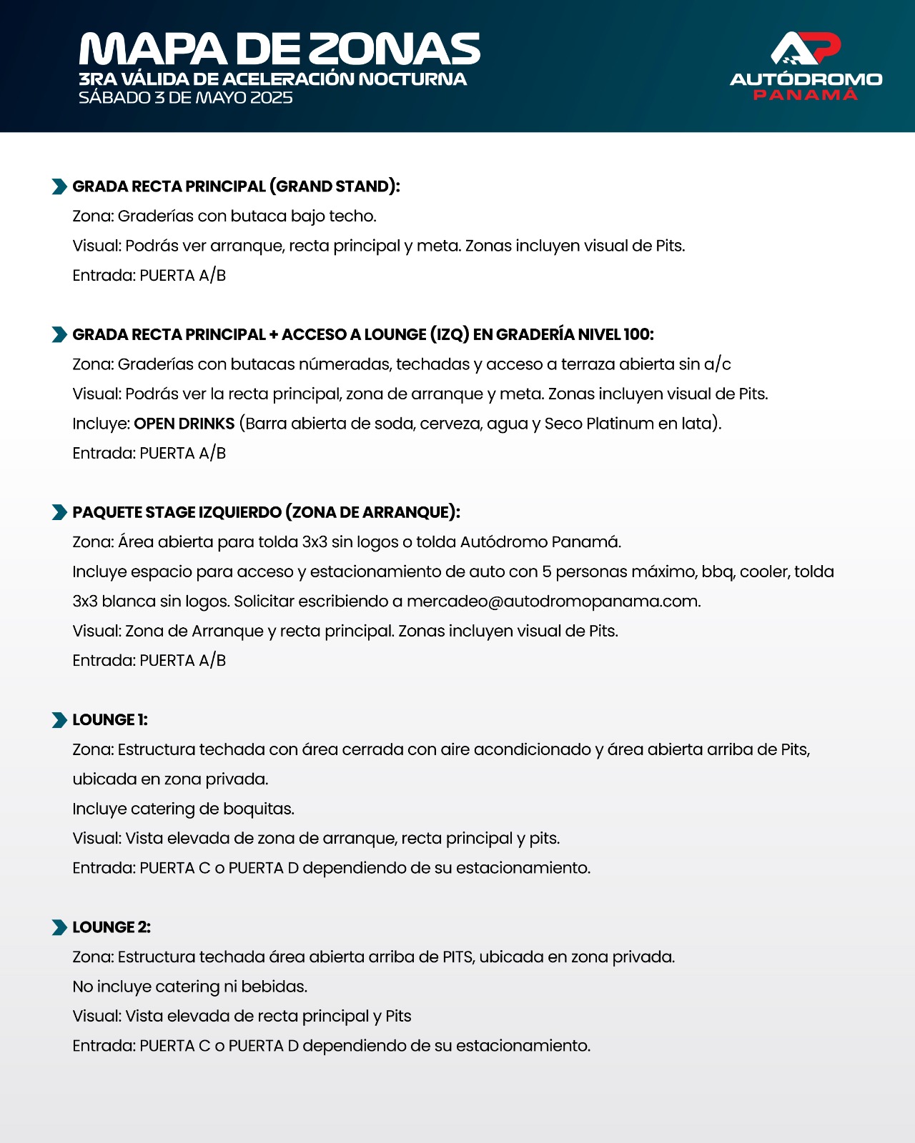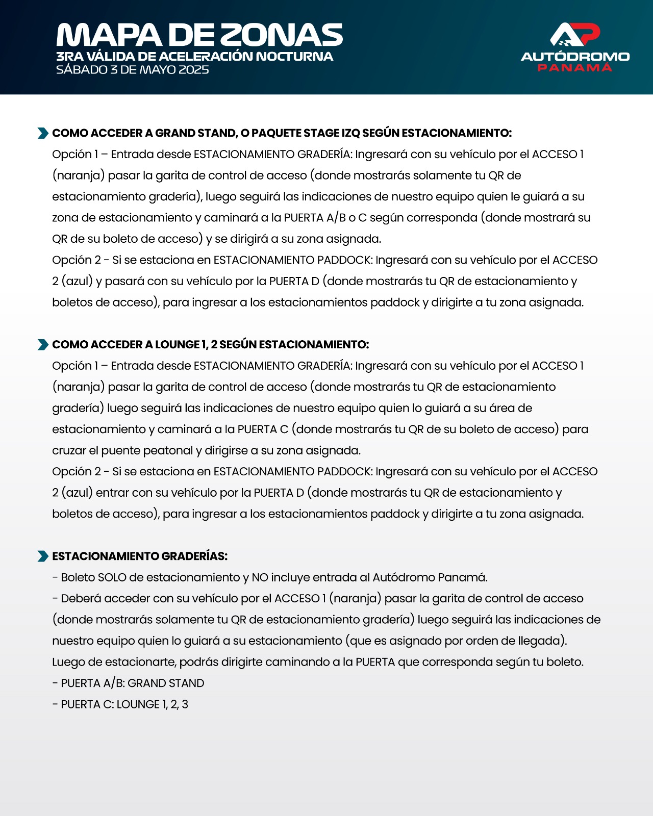 – El estacionamiento no está vigilado. El Autódromo Panamá no se responsabiliza por robos o daños en vehículos.