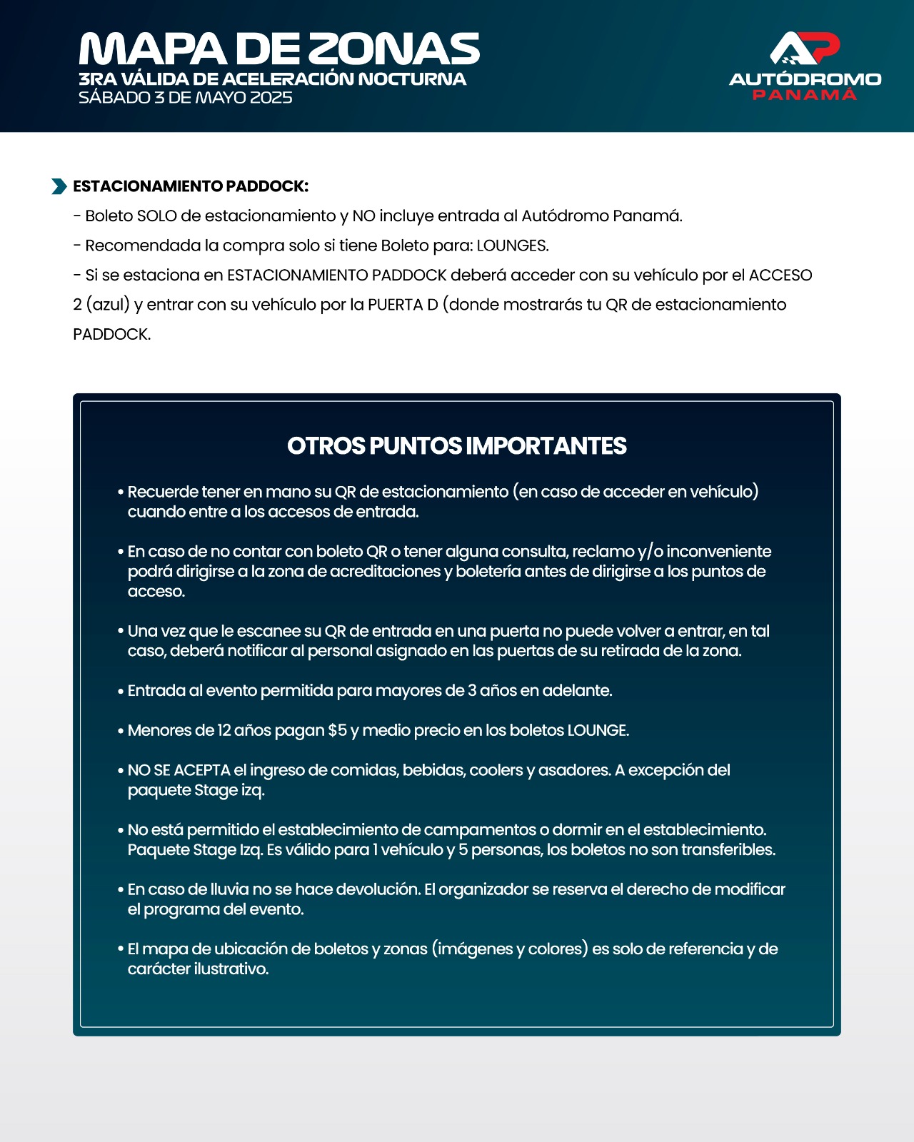 – Al ingresar al Autódromo, el asistente autoriza de manera gratuita e irrevocable la captación, reproducción y difusión de su imagen, voz y/o nombre mediante fotografías, grabaciones de video o transmisiones en directo dentro del Autódromo Panamá.