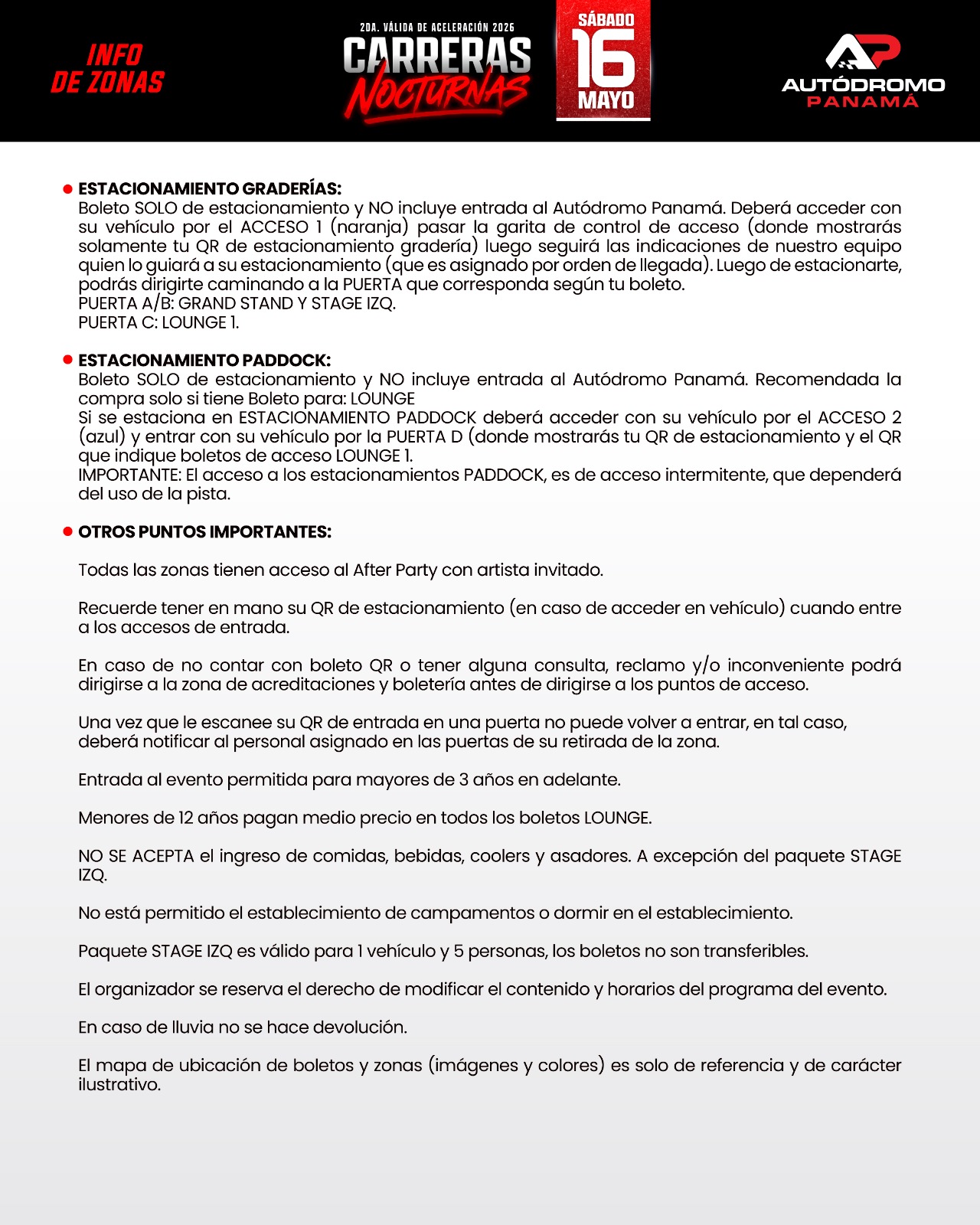 – Al ingresar al Autódromo, el asistente autoriza de manera gratuita e irrevocable la captación, reproducción y difusión de su imagen, voz y/o nombre mediante fotografías, grabaciones de video o transmisiones en directo dentro del Autódromo Panamá.