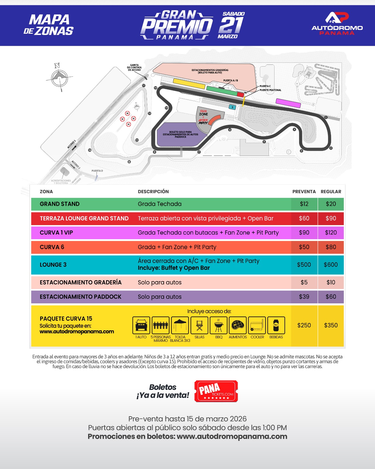 – Queda prohibida la transmisión en vivo (streaming), grabación profesional o cualquier uso comercial sin autorización expresa del Autódromo Panamá.
