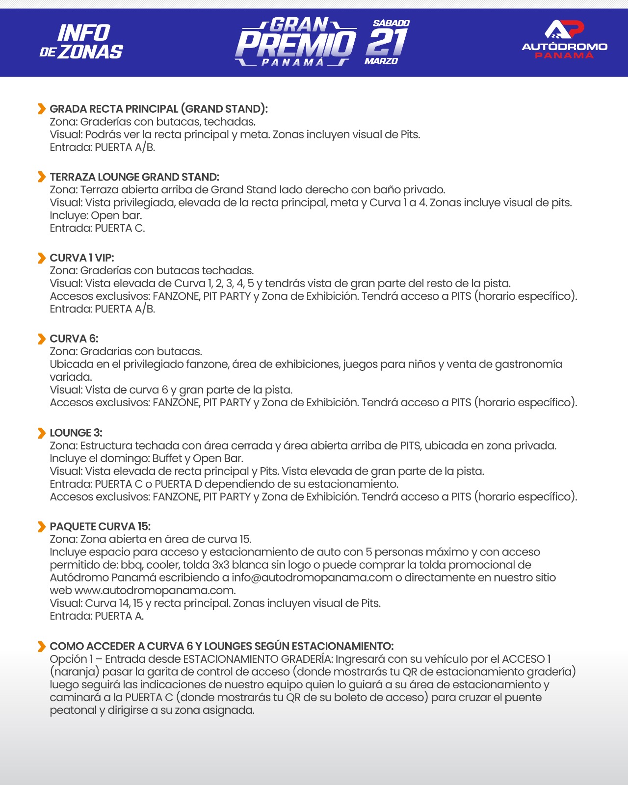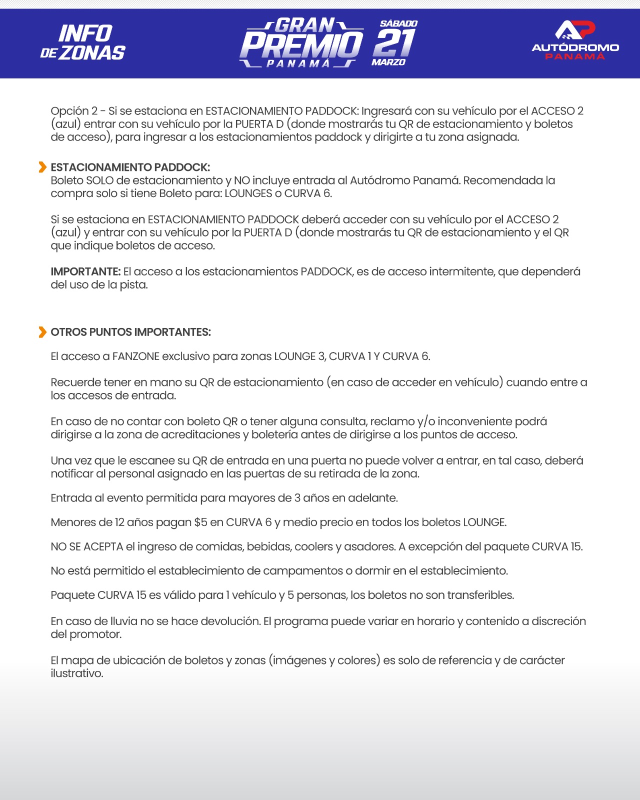 – Al ingresar al Autódromo, el asistente autoriza de manera gratuita e irrevocable la captación, reproducción y difusión de su imagen, voz y/o nombre mediante fotografías, grabaciones de video o transmisiones en directo dentro del Autódromo Panamá.