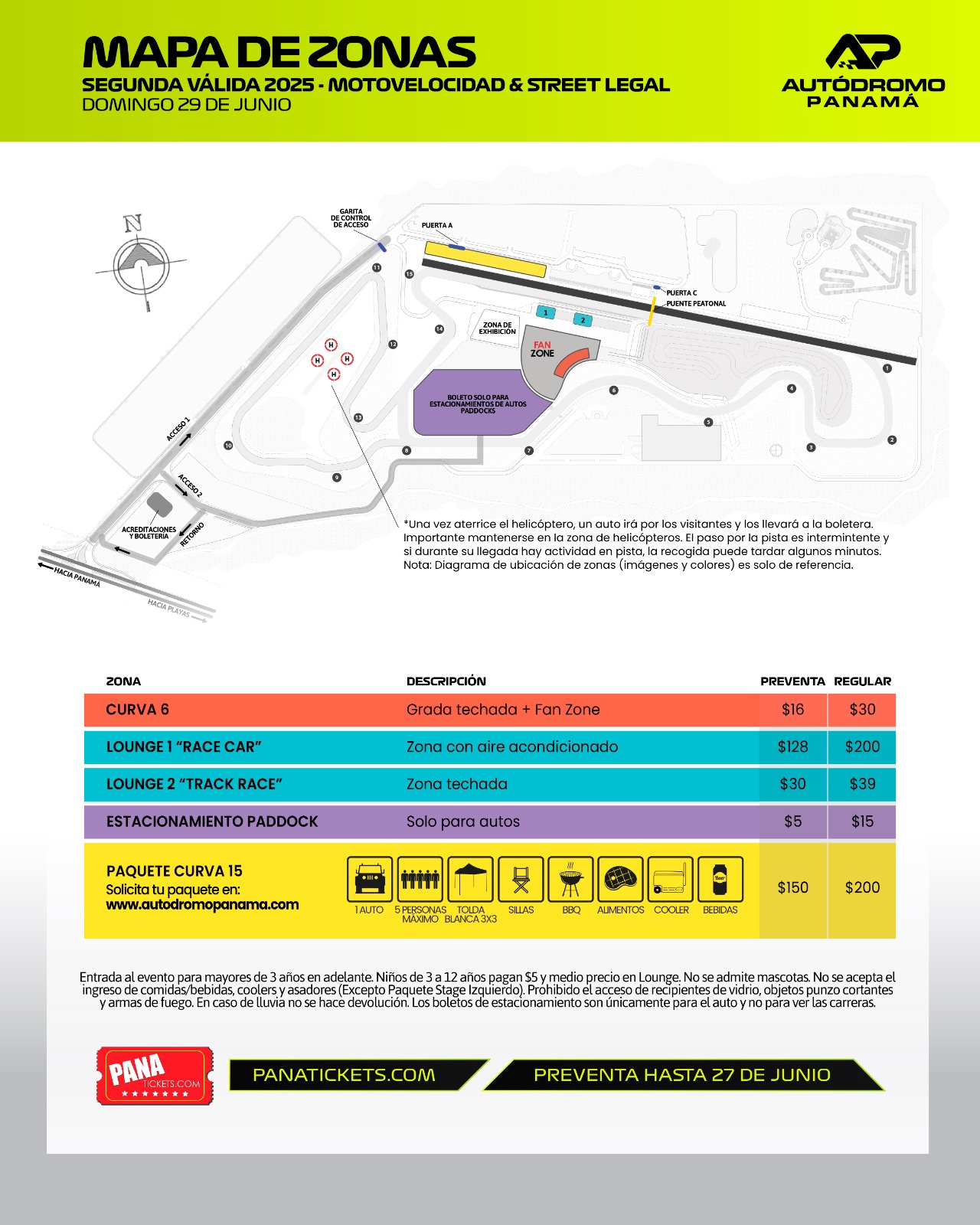 – Al ingresar al Autódromo, el asistente autoriza de manera gratuita e irrevocable la captación, reproducción y difusión de su imagen, voz y/o nombre mediante fotografías, grabaciones de video o transmisiones en directo dentro del Autódromo Panamá.