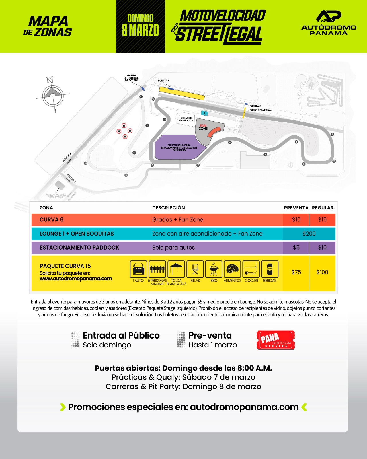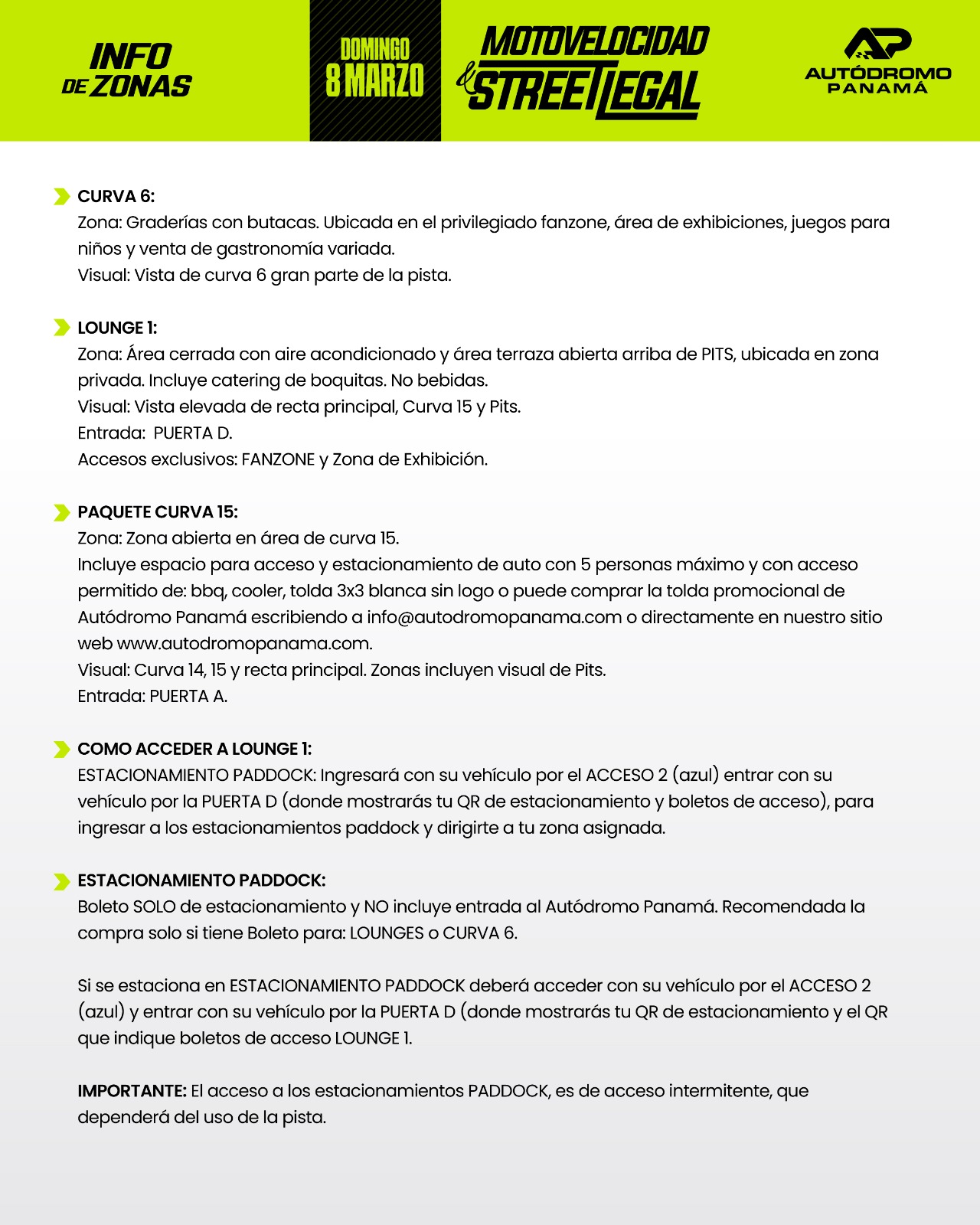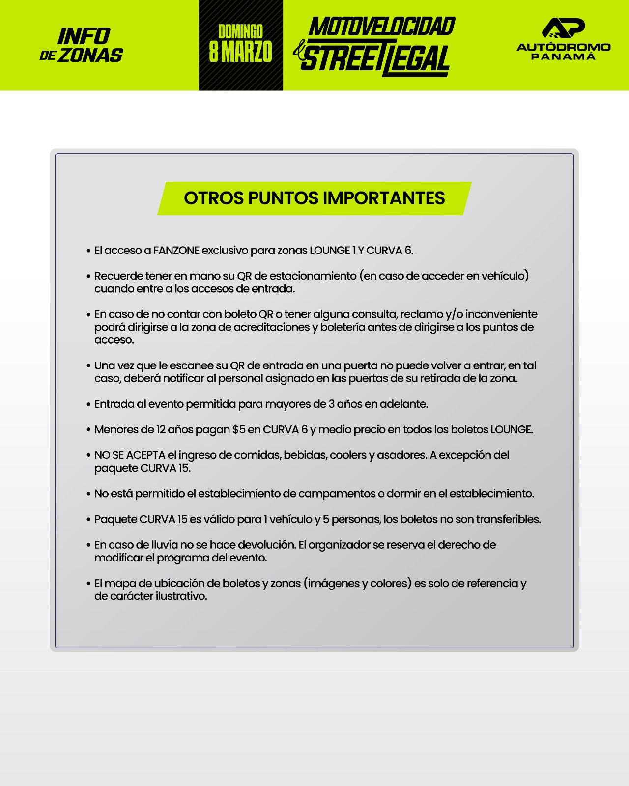 – Al ingresar al Autódromo, el asistente autoriza de manera gratuita e irrevocable la captación, reproducción y difusión de su imagen, voz y/o nombre mediante fotografías, grabaciones de video o transmisiones en directo dentro del Autódromo Panamá.