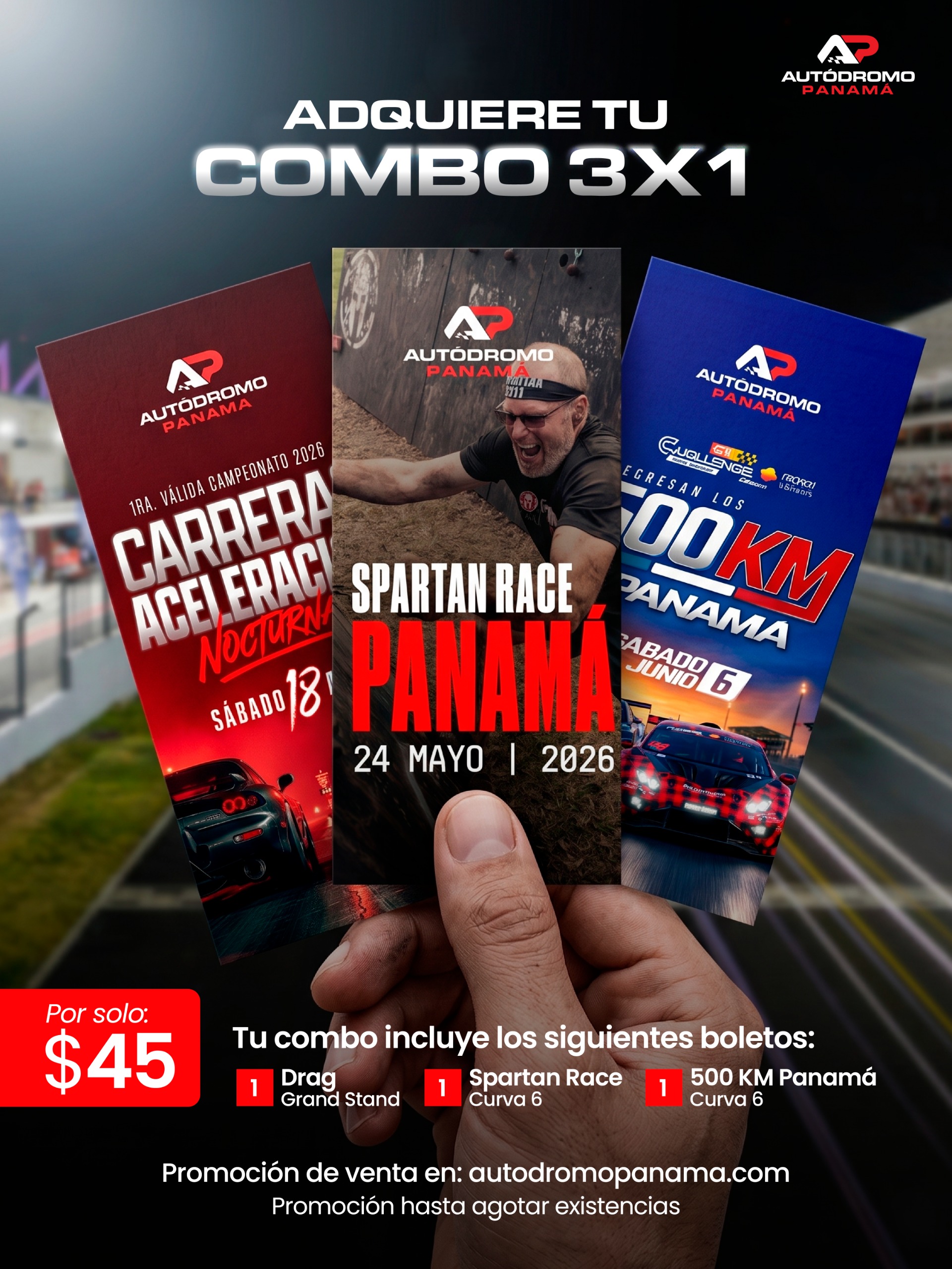 ADQUIERE TU COMBO 3X1 – Presenta 02 D 04 H 43 M 04 S DRAG CARRERAS DE ACELERACIÓN NOCTURNAS | SÁBADO 18 DE ABRIL | 1RA VÁLIDA CAMPEONATO 2026 + SPARTAN RACE PANAMÁ | 24 DE MAYO 2026 | AUTÓDROMO PANAMÁ + 500 KM PANAMÁ | SÁBADO 6 DE JUNIO 2026