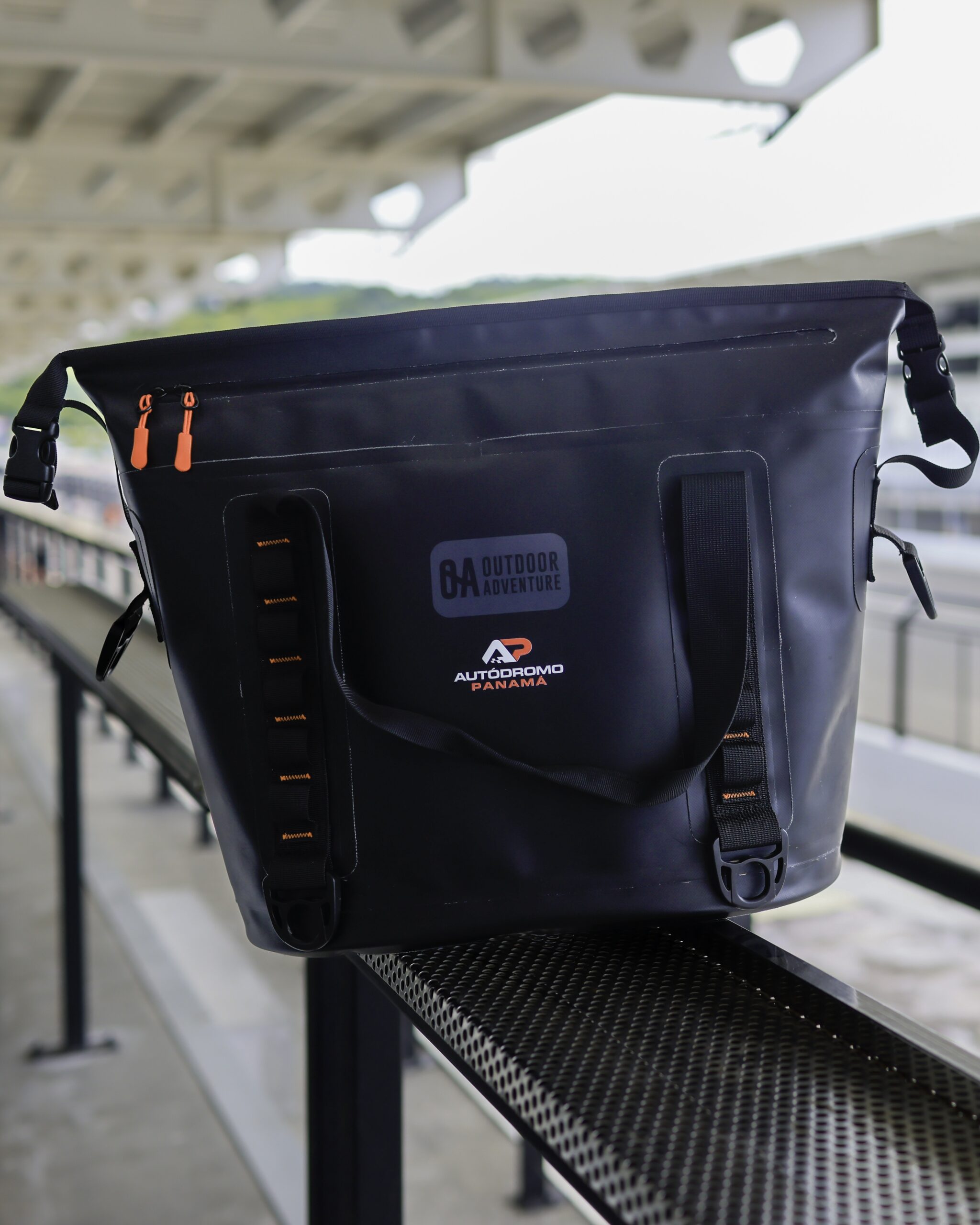 Cooler Outdoor Adventure de 30L con logo Autódromo Panamá, diseño estilo cartera y aislamiento térmico. Ideal para tus escapadas con estilo y funcionalidad.
