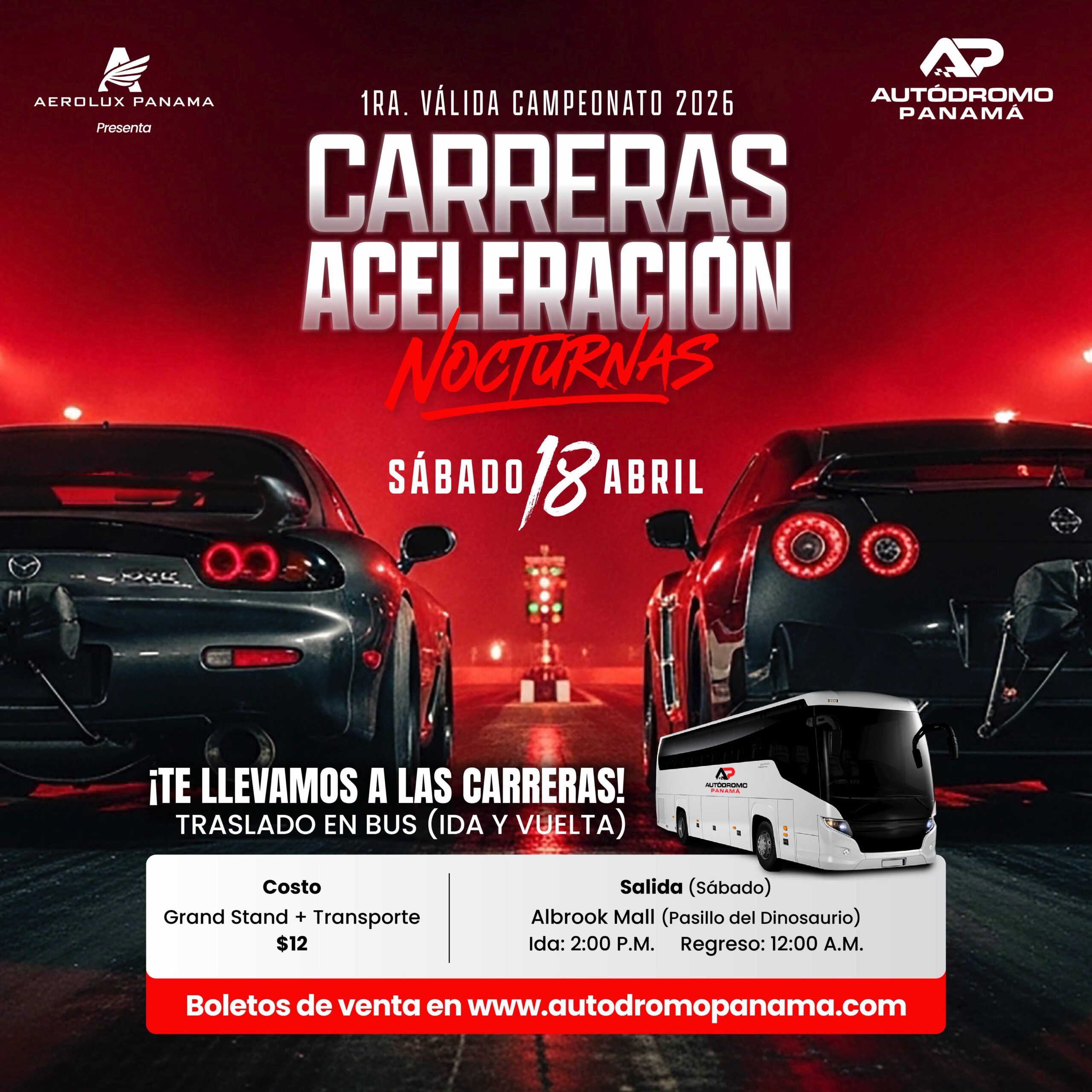 Grand Stand + Transporte (Albrook Mall, Pasillo del Dinosaurio) DRAG CARRERAS DE ACELERACIÓN NOCTURNAS | SÁBADO 18 DE ABRIL | 1RA VÁLIDA CAMPEONATO 2026