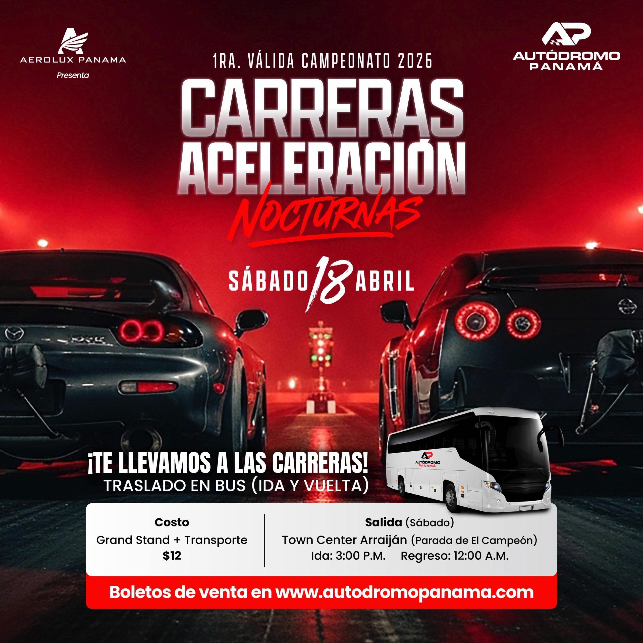 Grand Stand + Transporte (Town Center Arraiján, Parada de El Campeón) DRAG CARRERAS DE ACELERACIÓN NOCTURNAS | SÁBADO 18 DE ABRIL | 1RA VÁLIDA CAMPEONATO 2026