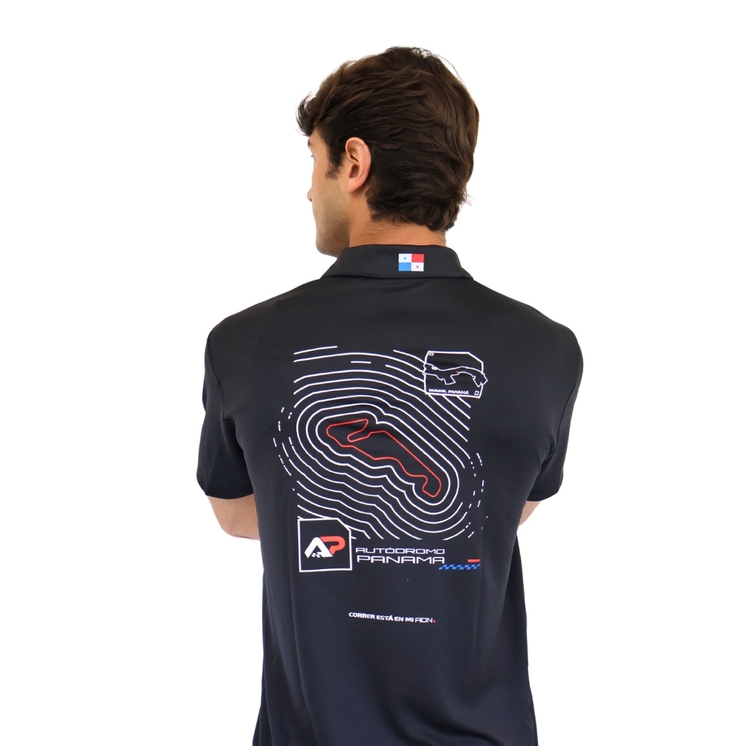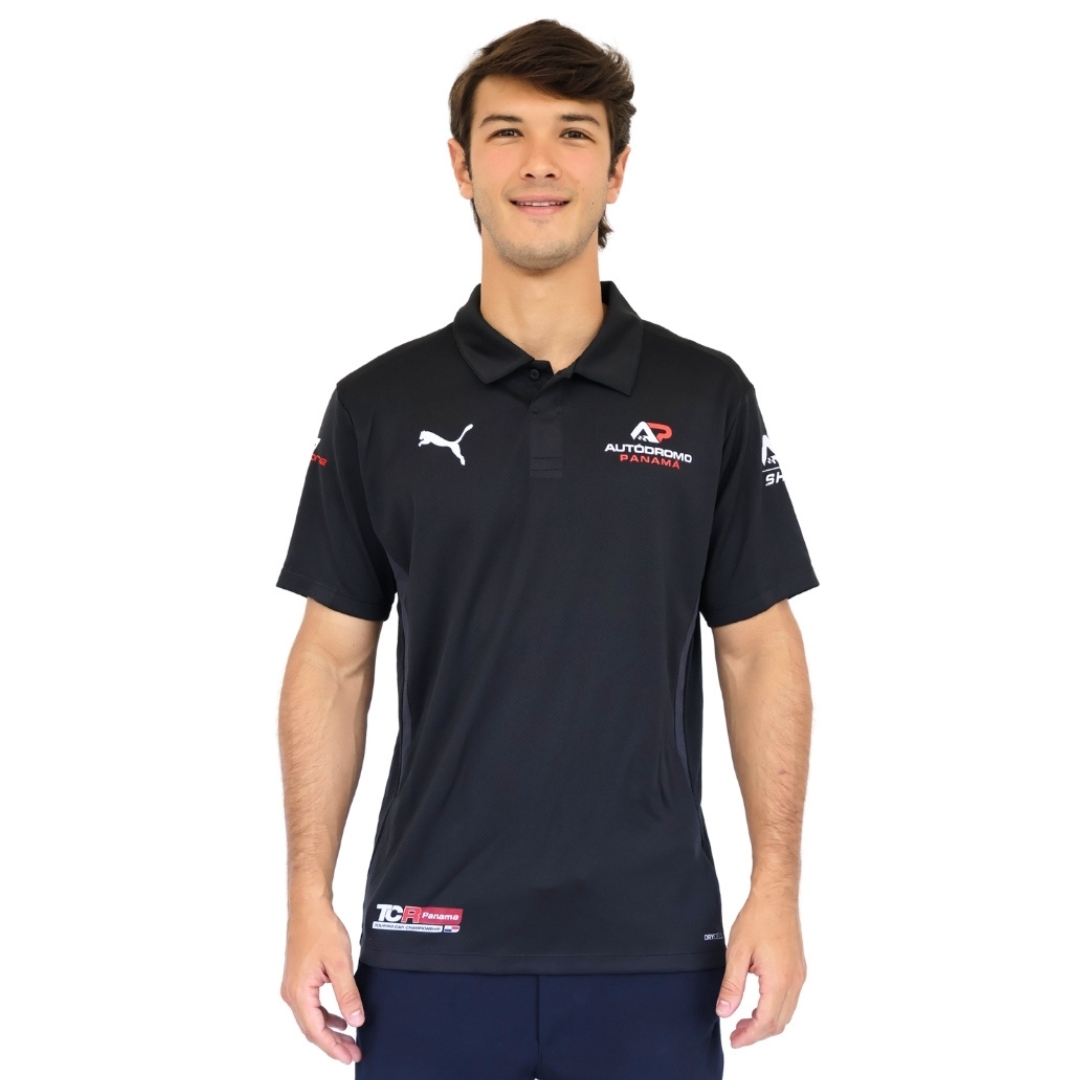 Polo Puma para caballero con logo AP Autódromo Panamá, trazado del circuito sobre huella en la espalda y logo TCR Panamá en la parte inferior. Diseño exclusivo que une estilo, identidad y pasión por las carreras.