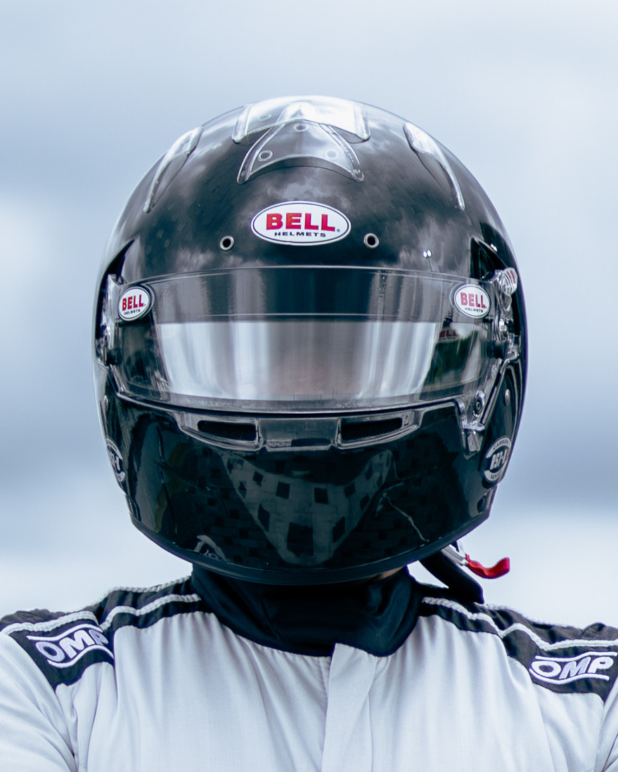 Casco de carbono ultraligero con visera antiniebla, ventilación avanzada y homologaciones FIA8859 y Snell SA2020.