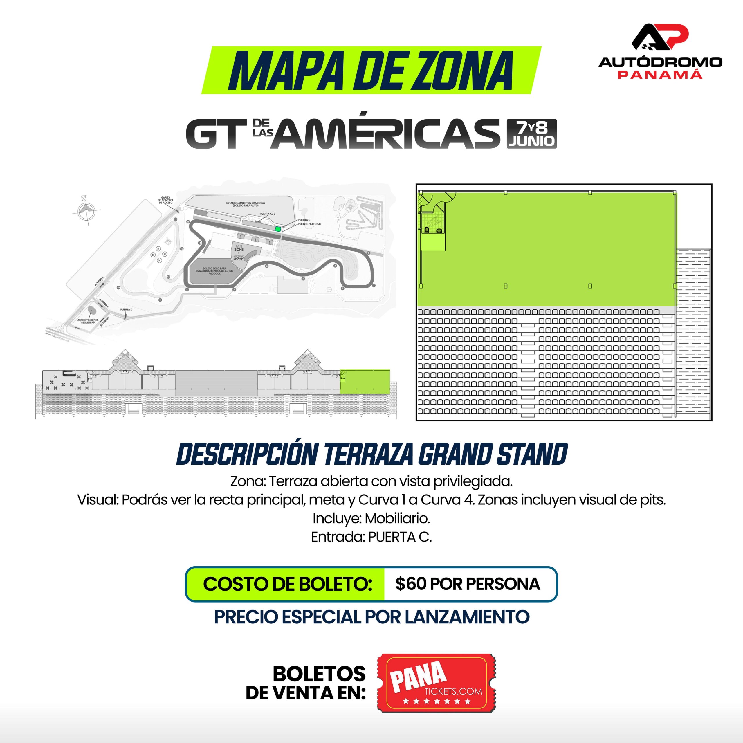 Terraza - Grand Stand Derecho - Piso 200. Zona: Terraza abierta con vista privilegiada. Visual: Podrás ver la recta principal, meta y curva 1 a curva 4. Zonas incluyen visual de pits. Incluye: Mobiliario. Entrada: PUERTA C.